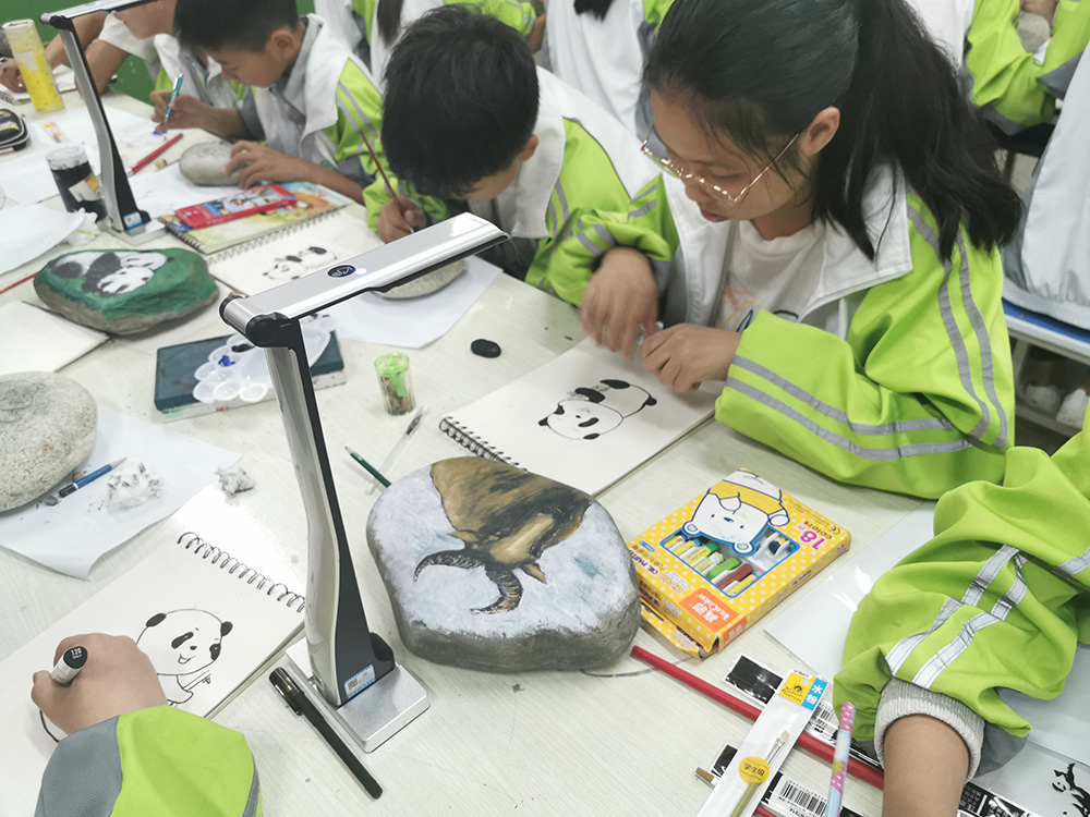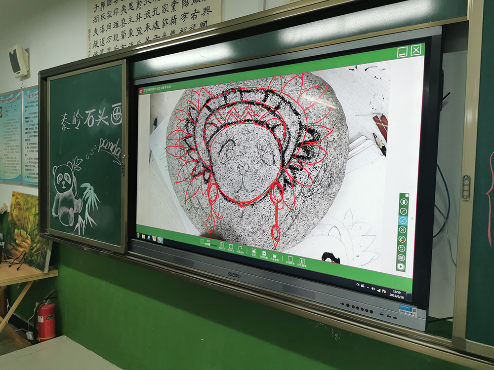 在熊貓石頭畫(huà)美術(shù)課上,師生們正在使用吉星捐贈(zèng)的未來(lái)智慧美術(shù)全互動(dòng)系統(tǒng)進(jìn)行美術(shù)教學(xué)。