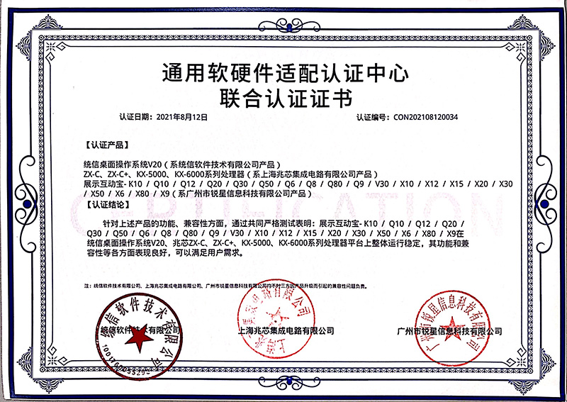 兆芯認證證書(無線視頻展臺、視頻采集互動終端)