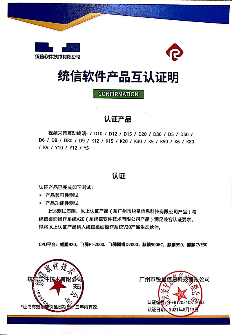 統信認證證書(展示互動寶、無線微錄儀)