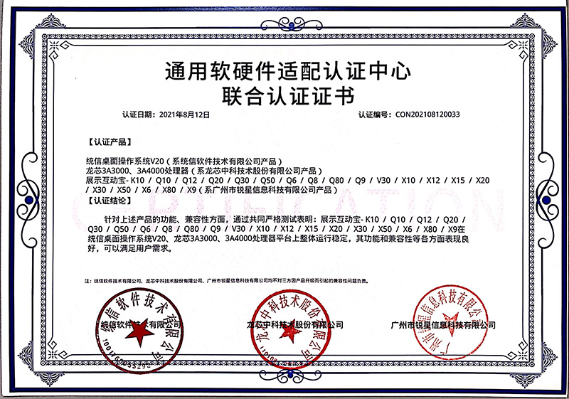 龍芯認證證書(展示互動寶、無線微錄儀)