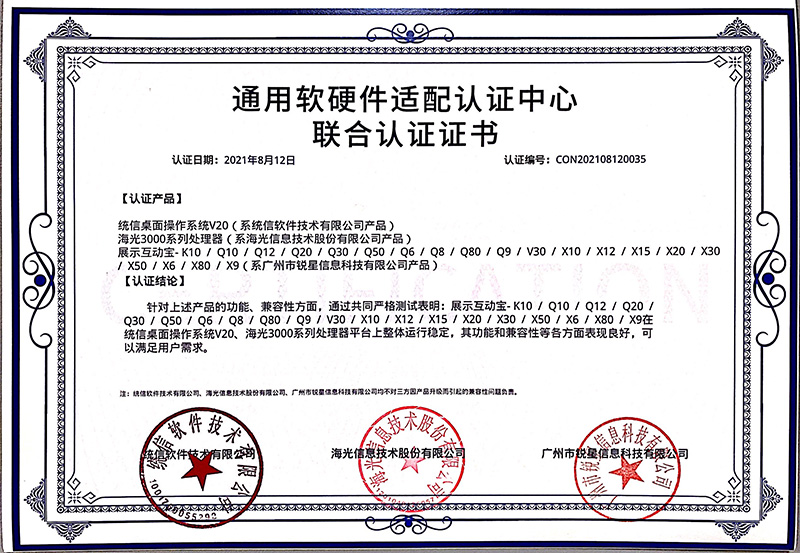 日前,由吉星子公司銳星信息科技自主研發的無線展臺系列產品與統信UOS桌面操作系統V20完成產品兼容性測試以及產品功能性測試。