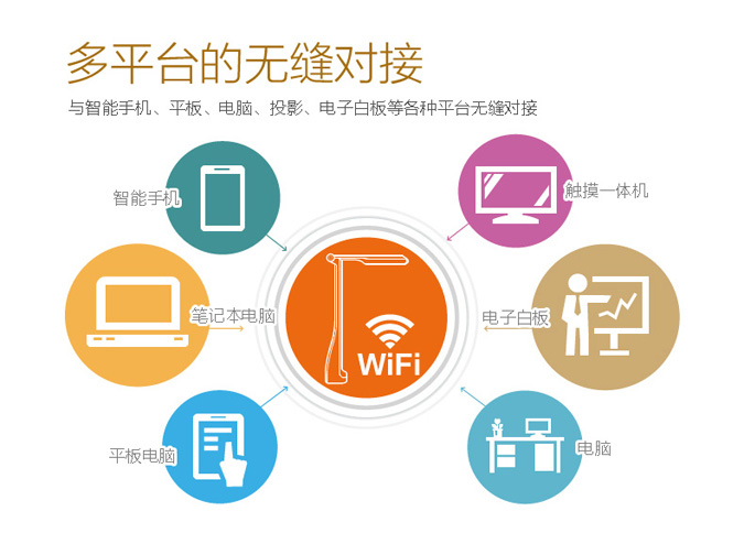 無線視頻展臺可以通過WIFI同步連接到電子白板、一體機(jī)、電腦、筆記本、平板、手機(jī),在課堂上用各種設(shè)備觀看的同時(shí)還可以將老師的教學(xué)過程錄制下來,隨時(shí)隨地回放視頻,方便學(xué)生溫故知新 。