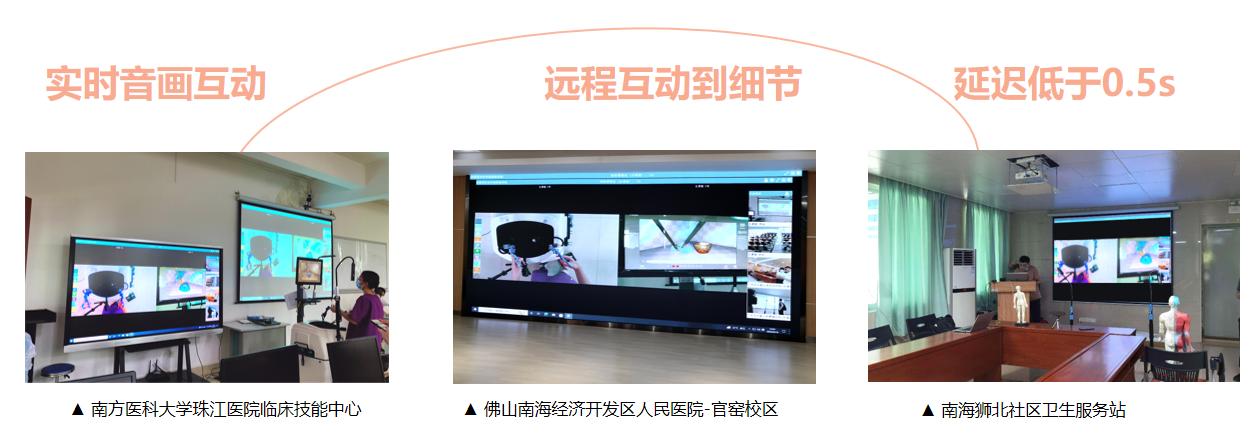 南方醫科大學珠江醫院臨床技能中心通過多模態強交互系統,實現與南海經濟開發區人民醫院-官窯校區、獅北服務站3方互聯互通,進行遠程培訓,異地展示老師的手法和機器內部的操作細節,異地培訓教學也可達到面對面效果,共享優質的醫療設備資源,擴大名師的教學受眾面,提高培訓的質量。