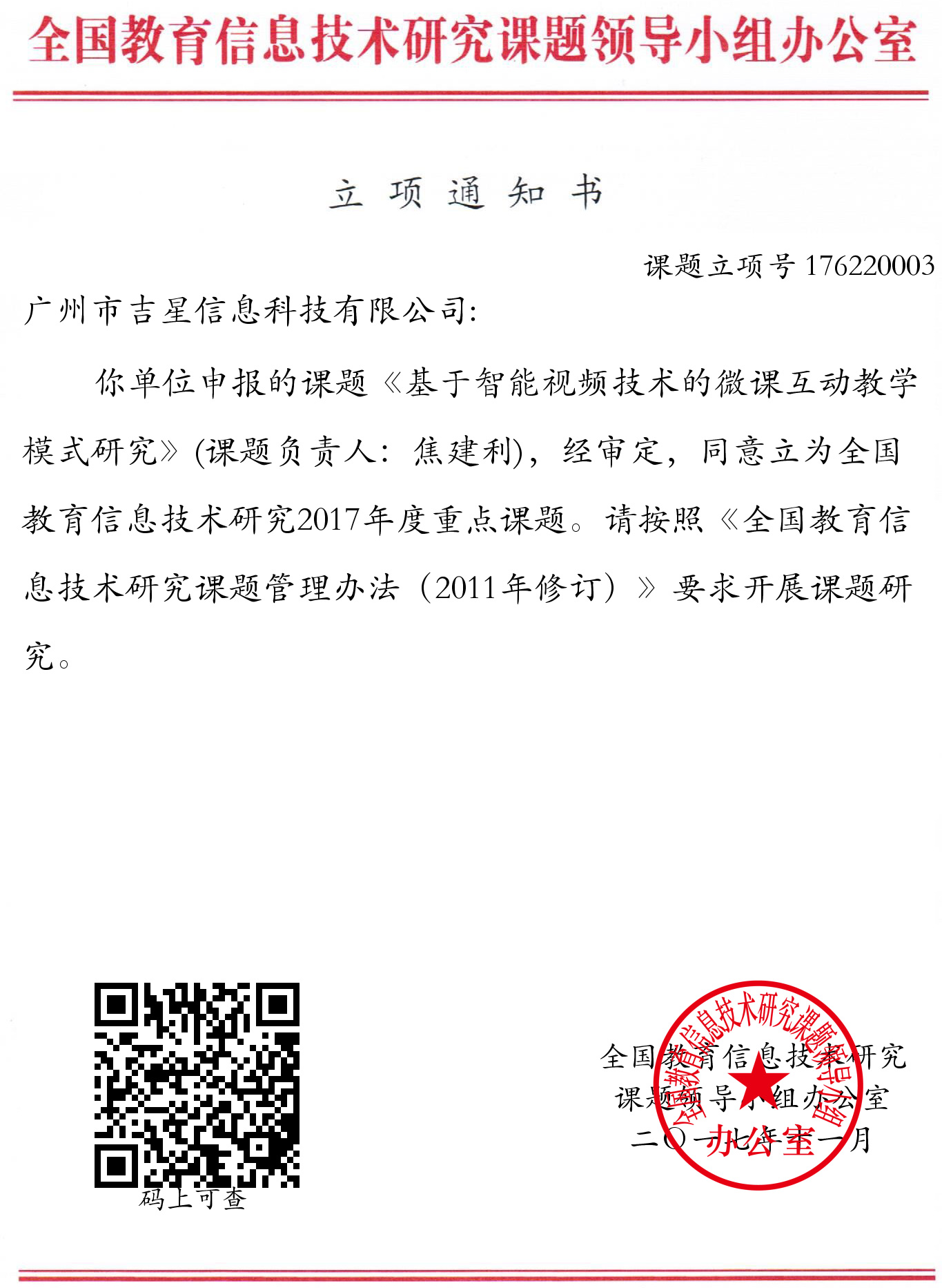 “基于智能視頻技術(shù)的微課互動教學(xué)模式研究”課題是全國教育信息技術(shù)研究課題領(lǐng)導(dǎo)小組辦公室(以下簡稱“課題辦”)批準(zhǔn)立項的全國教育信息技術(shù)研究2017年度重點課題(立項號:17622003),旨在完善基于新型智能視頻技術(shù)的微課互動教學(xué)系統(tǒng)的基礎(chǔ)上,創(chuàng)建基于新型智能視頻技術(shù)的微課互動教學(xué)平臺應(yīng)用的方法與模式,目的在于使教學(xué)系統(tǒng)既具有獲取教學(xué)資源,組織、展示、交流、學(xué)生自主、協(xié)作與探究性學(xué)習(xí)的過程與成果的功能,又具有針對學(xué)生的學(xué)習(xí)情況實時制作、應(yīng)用微課資源的功能,還具有師生、家長共享、共用微課等教學(xué)資源的功能;并且使微課能夠更好地支持信息技術(shù)與教育教學(xué)活動的融合創(chuàng)新發(fā)展,更加有效地提高教育教學(xué)的效率與質(zhì)量。本課題由廣州市吉星信息科技有限公司承擔(dān),由華南師范大學(xué)焦建利教授擔(dān)任課題組組長。課題邀請了國內(nèi)知名的教育信息技術(shù)專家、學(xué)科教學(xué)專家等組成專家組對課題進(jìn)行指導(dǎo)。